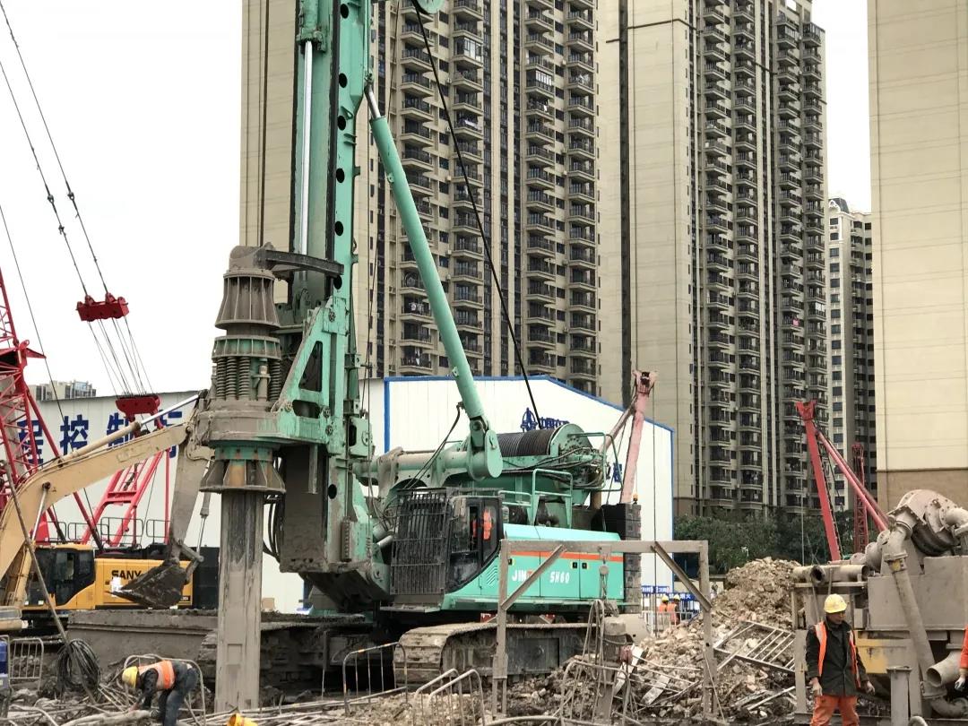 观摩工程为佛山市顺德区南国东路延伸线工程,位于顺德区东部新城。工程路线全长2.7km,其中跨容桂水道大桥桥梁总长2222.5m,为高低塔混合梁斜拉桥。桥梁南岸主桥桩基础设计桩径2.5米,桩深78米,地下22米进入岩层。因岩层地质呈泥岩和砂岩交错分布状态,无法整体取芯钻进,经过充分论证和试桩情况,考量成孔效率和施工成本双重因素,确定采用大型钻机对岩层进行全断面破碎后成孔成桩的工艺。特殊地质条件、又是超深、超大孔径桩型,对旋挖的加压能力、传扭效率、钻进稳定性、钻具匹配、以及机手的操作都有极高的技术要求。经过近2个月的施工验证,金泰SH大旋挖的整机状态稳定可靠,施工效率超越同一工地竞品机型80%,获得项目部和客户一致点赞。